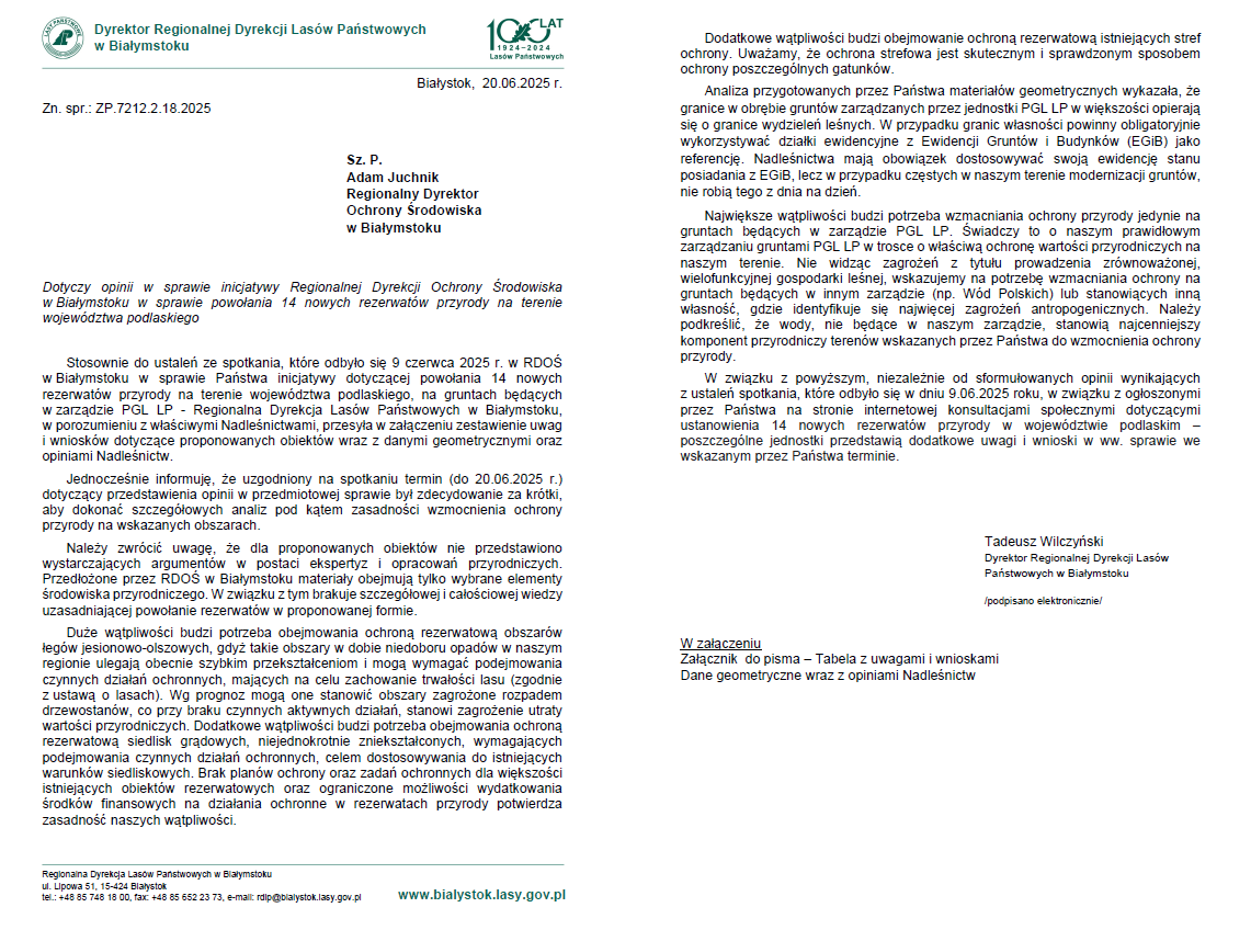 My już podjęliśmy konsultacje w sprawie planowanych rezerwatów. Poniżej zamieszczamy merytoryczne uwagi które, przesłaliśmy do RDOŚ w Białymstoku, pismo oraz załącznik tabelaryczny.